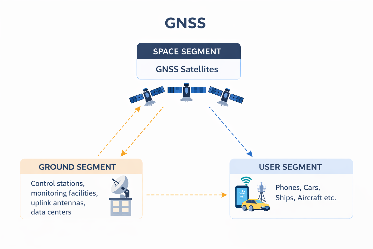 Global Navigation Satellite Systems (GNSS) refers to the collective satellite constellations that provide global positioning, navigation, and timing (PNT) services. Each system is built on three interconnected segments: